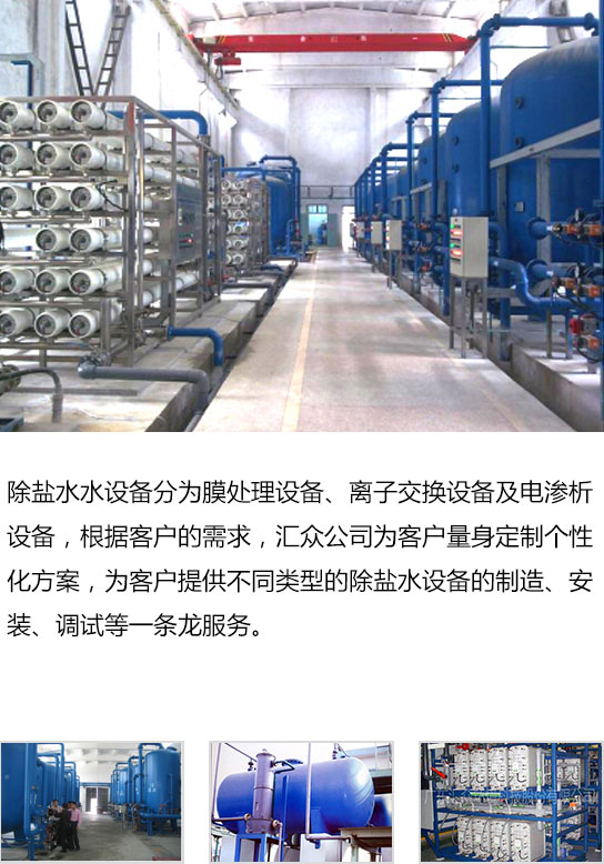 除鹽水水設備分為膜處理設備、離子交換設備及電滲析設備,根據客戶的需求,匯眾公司為客戶量身定制個性化方案,為客戶提供不同類型的除鹽水設備的制造、安裝、調試等一條龍服務。