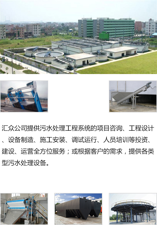 匯眾公司提供污水處理工程系統的項目咨詢、工程設計、設備制造、施工安裝、調試運行、人員培訓等投資、建設、運營全方位服務;或根據客戶的需求,提供各類型污水處理設備。
